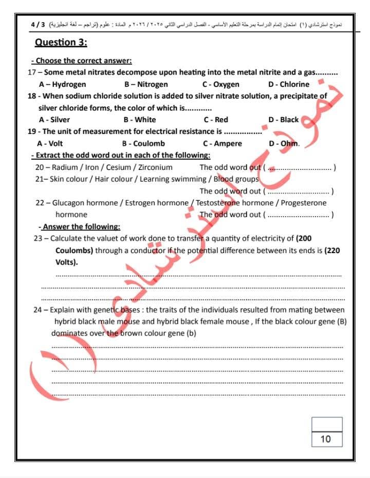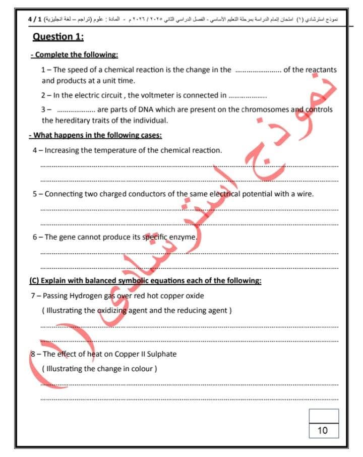 ويستهدف النموذج تدريب الطلاب على أنماط متعددة من الأسئلة التي تقيس الفهم والاستيعاب والتطبيق العملي للمفاهيم العلمية، بما يسهم في تنمية مهارات التفكير العلمي لديهم، ورفع كفاءتهم في التعامل مع ورقة الامتحان بثقة وكفاءة.