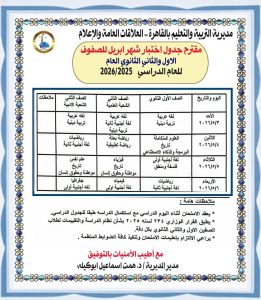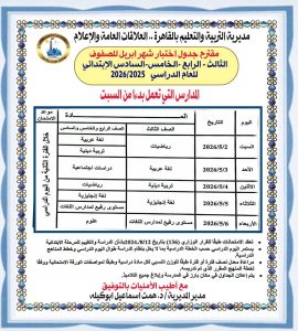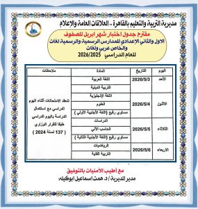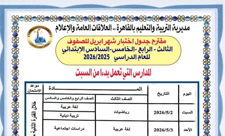 أعلنت مديرية التربية والتعليم بالقاهرة برعاية الدكتورة همت إسماعيل أبو كيلة، مدير المديرية، طرح مقترح جداول امتحانات شهر أبريل لصفوف النقل بمراحل التعليم الثلاث (الابتدائية – الإعدادية – الثانوية) للعام الدراسي ٢٠٢٥-٢٠٢٦، وذلك خلال الفترة من يوم السبت الموافق ٢٠٢٦/٥/٢ حتى يوم الأربعاء الموافق ٢٠٢٦/٥/٦.