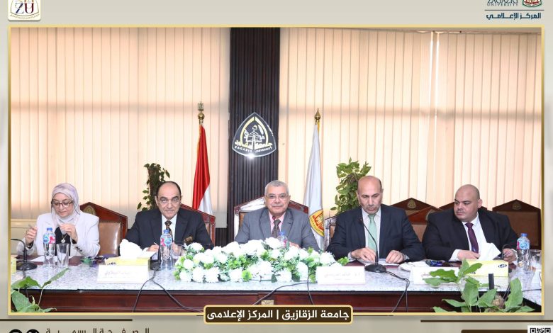 عقد مجلس جامعة الزقازيق جلسته الشهرية رقم (٥٩٩)، اليوم الإثنين، برئاسة الدكتور خالد الدرندلي رئيس الجامعة، وبحضور الدكتور إيهاب الببلاوى نائب رئيس الجامعة للدراسات العليا والبحوث، والدكتور هلال عفيفى نائب رئيس الجامعة لشئون التعليم والطلاب، والدكتورة حنان النحاس نائب رئيس الجامعة لشئون خدمة المجتمع وتنمية البيئة، والدكتور سيد سالم أمين عام الجامعة، وعمداء الكليات وممثلي وكلاء الكليات.
