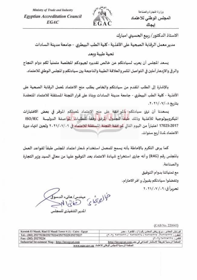 أرسل المجلس الوطني للإعتماد “ايجاك” خطابًا لمدير معمل صحة وسلامة الغذاء بكلية الطب البيطري بجامعة مدينة السادات يفيد موافقة المجلس علي اعتماد المعمل لإجراء بعض الإختبارات الميكروبيولوجية للأغذية وأنه يسمح للمعمل إستخدام شعار إعتماد المجلس.